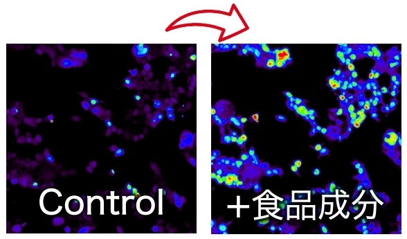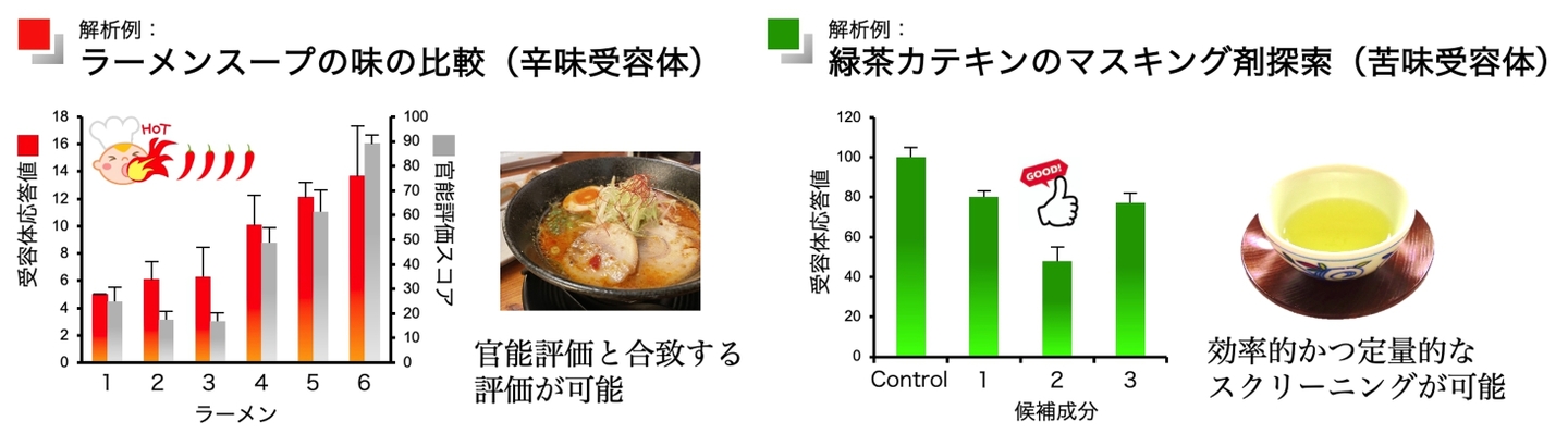 独自に構築した約430種類のヒト味覚・嗅覚受容体発現細胞を用い、受容体応答に伴って生じる蛍光・発光を測定することで、人間の繊細な感覚である味や匂いを分子レベルで定量的に解析できます。特許技術による高感度解析が可能です。